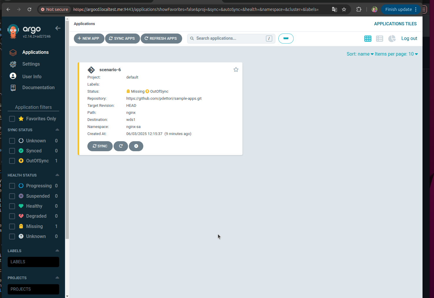 Note: If you encounter SSL certificate warnings in your browser, proceed with “Advanced” → “Proceed to argocd.localtest.me (unsafe)” or similar option, as this is expected for local development setups.